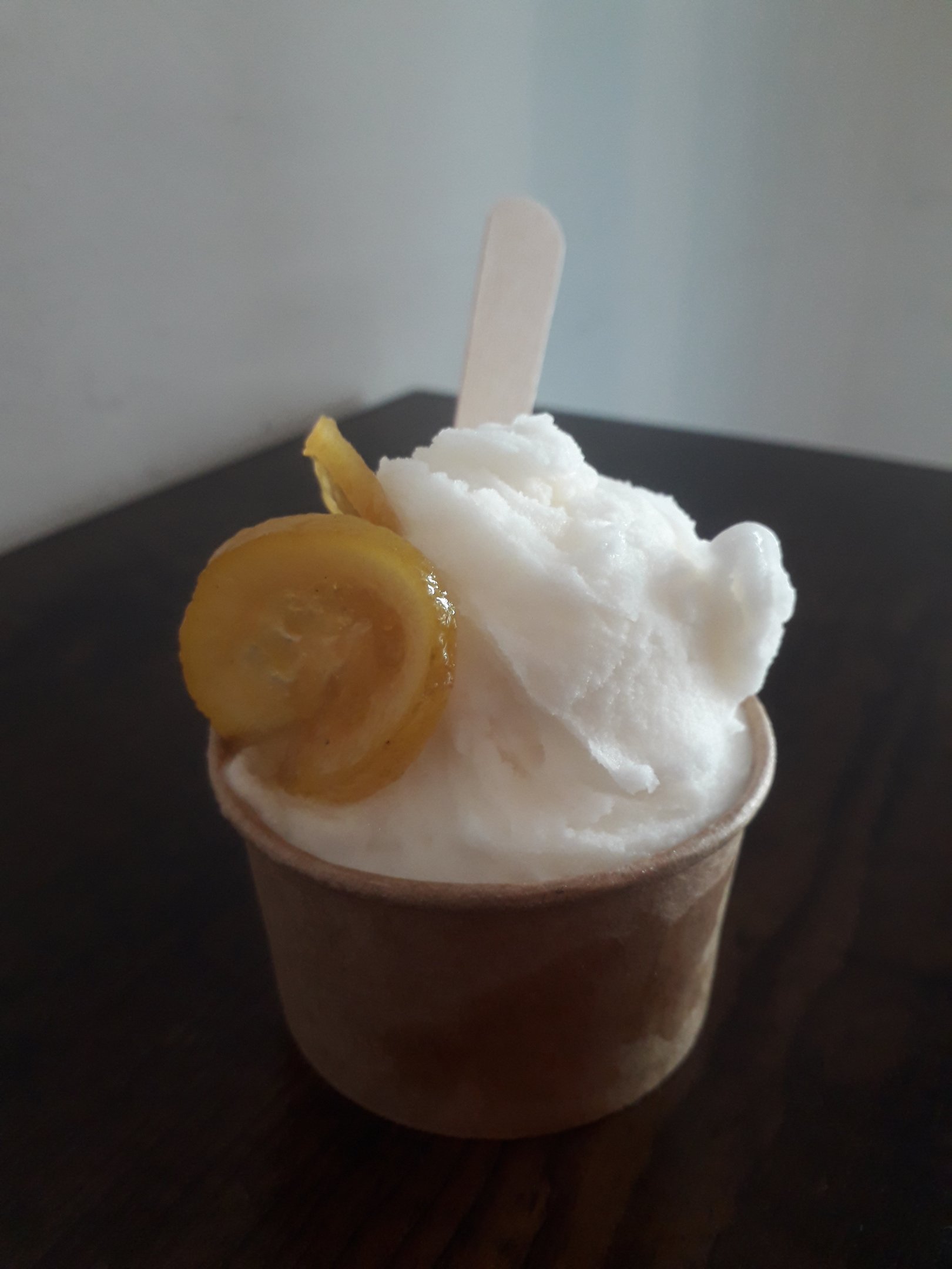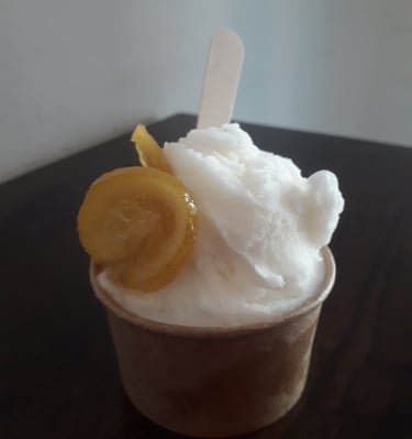 Süße Zitrusfrüchte - MandelOrange- und ZitroneMandel-Eis, Sahne und Deko.